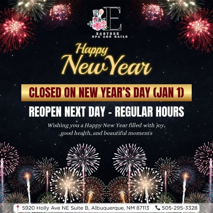Eastern Spa and Nails in Albuquerque, NM 87113, serving the Albuquerque community since 2018, is a luxury nail salon where passion, care, and expertise meet to provide an unforgettable experience. Offering a comprehensive range of top-notch nail services, our talented team of skilled technicians works with dedication and attention to detail to ensure every client leaves feeling pampered and beautiful. At Eastern Spa and Nails, we pride ourselves on being attentive listeners, always understanding and meeting the unique needs of each customer. We are committed to delivering honest service and working tirelessly to bring you the best nail care available. Our team, with years of experience, strives to create a welcoming, relaxing environment where every visit is a positive and satisfying experience. We truly appreciate your continued support and promise to continually enhance your time with us, ensuring your satisfaction with every visit. Thank you for choosing Eastern Spa and Nails—your trust means the world to us.